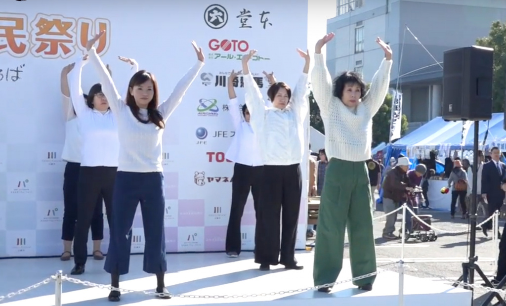 かわさき市民祭りで、気功動作を披露する谷本さん